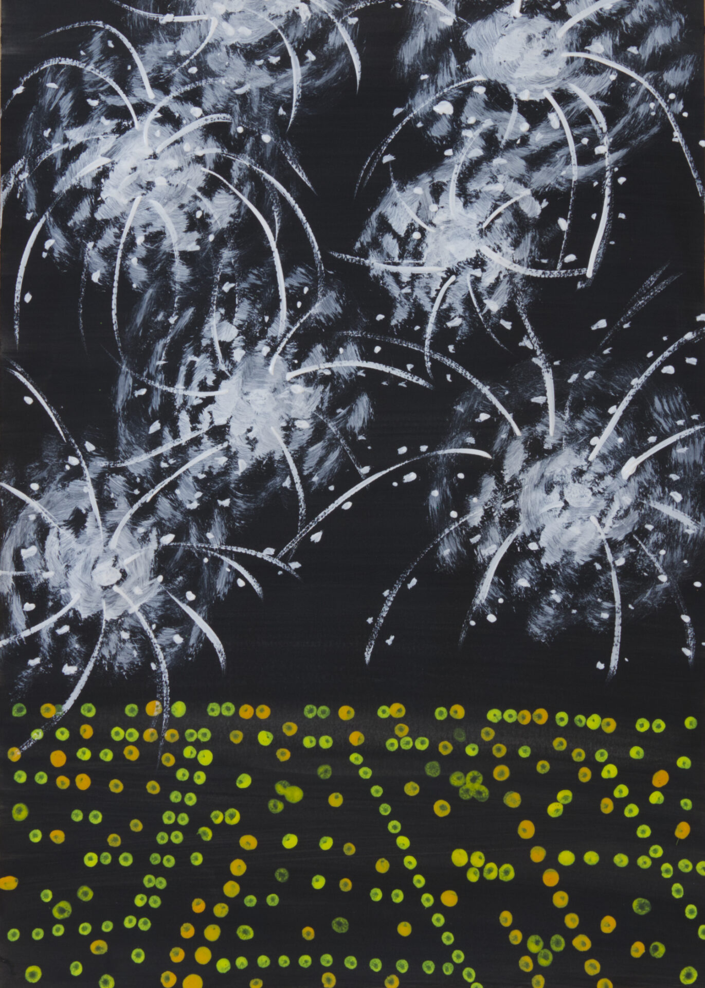 Das Bild wird mit Wasserfarben und Acrylfarben gemalt und die Lichter aufgedruckt. So vereint dieses Bild mehrere unterschiedliche Maltechniken miteinander.