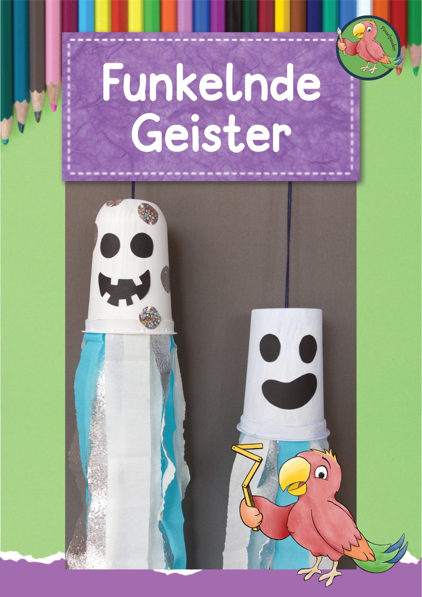 Glitzernde und funkelnde Geister könnt ihr von der Decke oder am Fenster hängen lassen. Dabei bewegt sich der Schweif aus Krepppapier leicht im Wind. Wer möchte, kann ein Licht befestigen und die Geister von innen beleuchten. Die Geister werden aus Plastikbechern, Tonpapier und Krepppapier gebastelt.