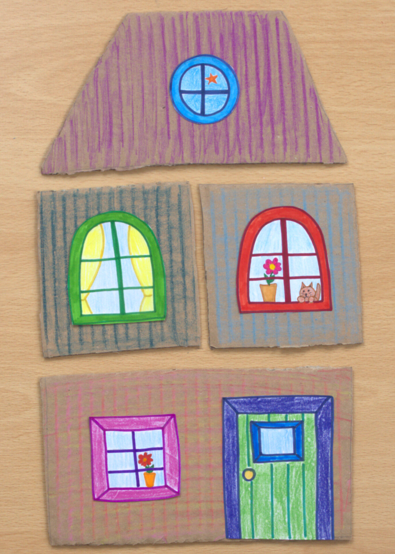 Diese kleine Collage wird aus Pappe und Zeichenpapier hergestellt. Die Kinder können ihr Haus bunt anmalen, individuell zusammenfügen und gestalten.