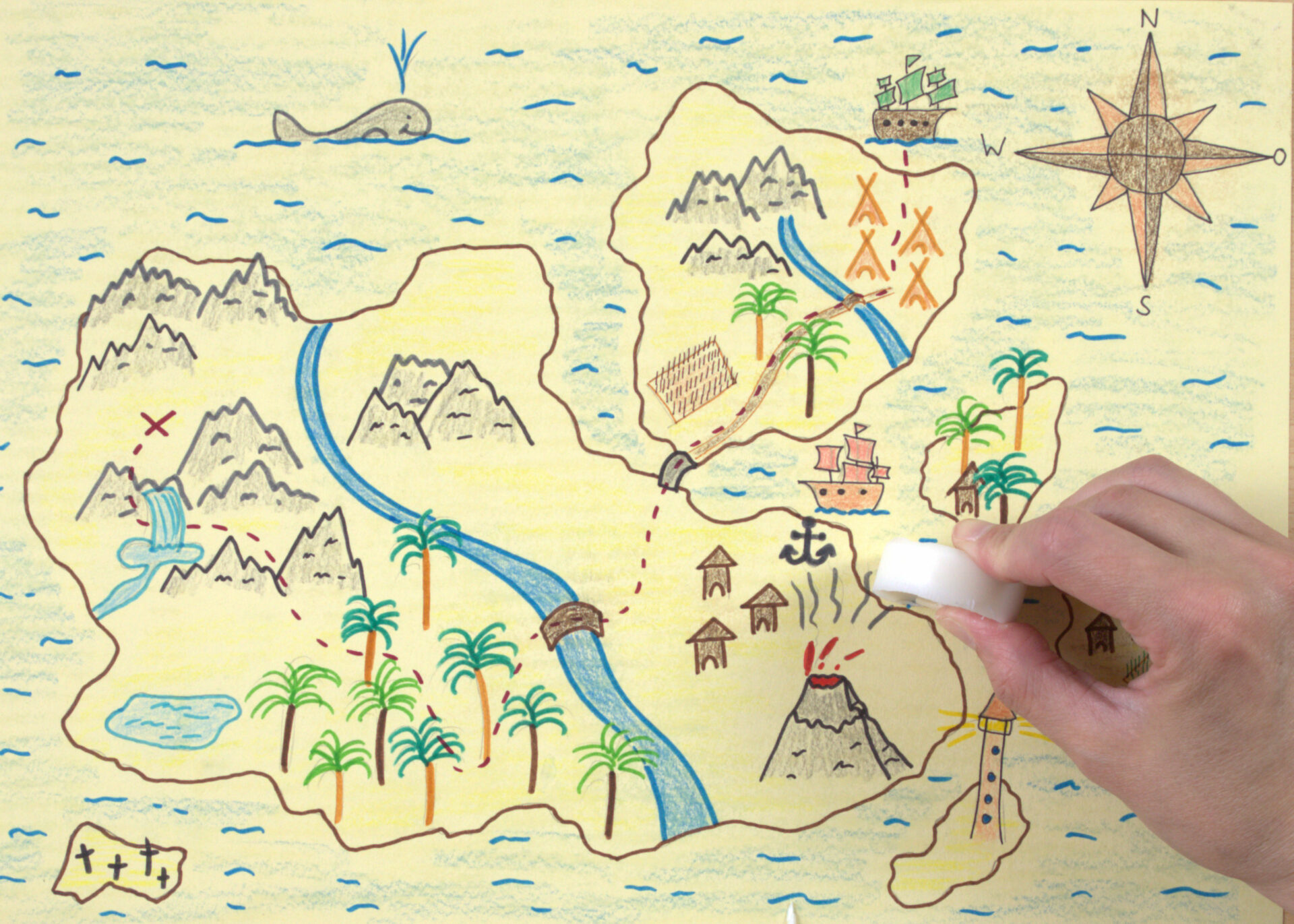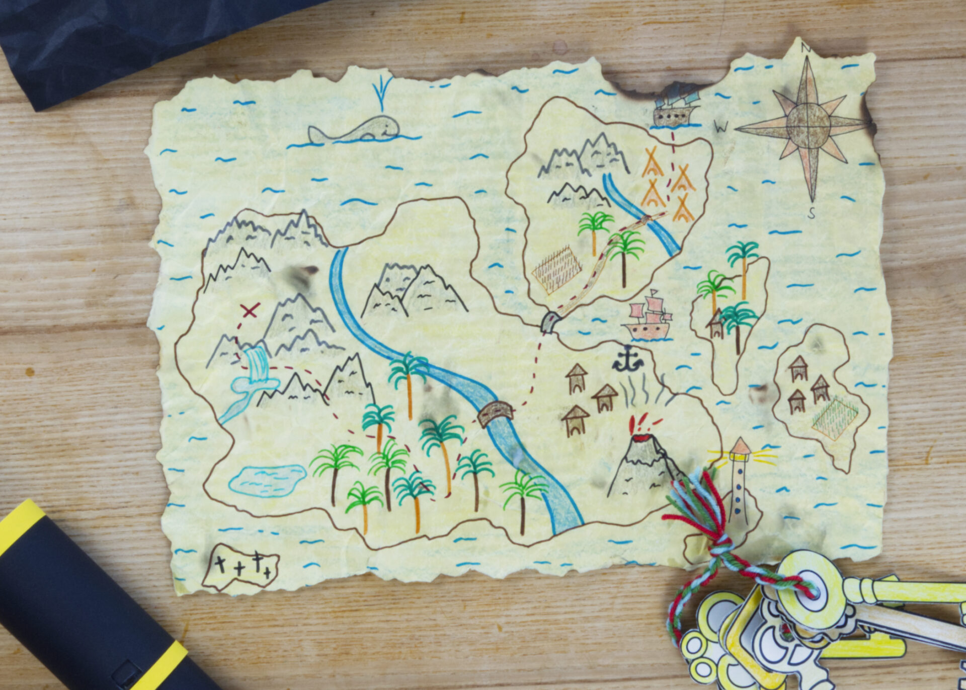 Geht auf große Schatzsuche. Eure selbstgebastelte Schatzkarte hilft euch dabei. Die Karten können die Kinder individuell gestalten. Anschließend werden sie von der Lehrkraft auf alt gemacht, damit sie noch authentischer wirken.