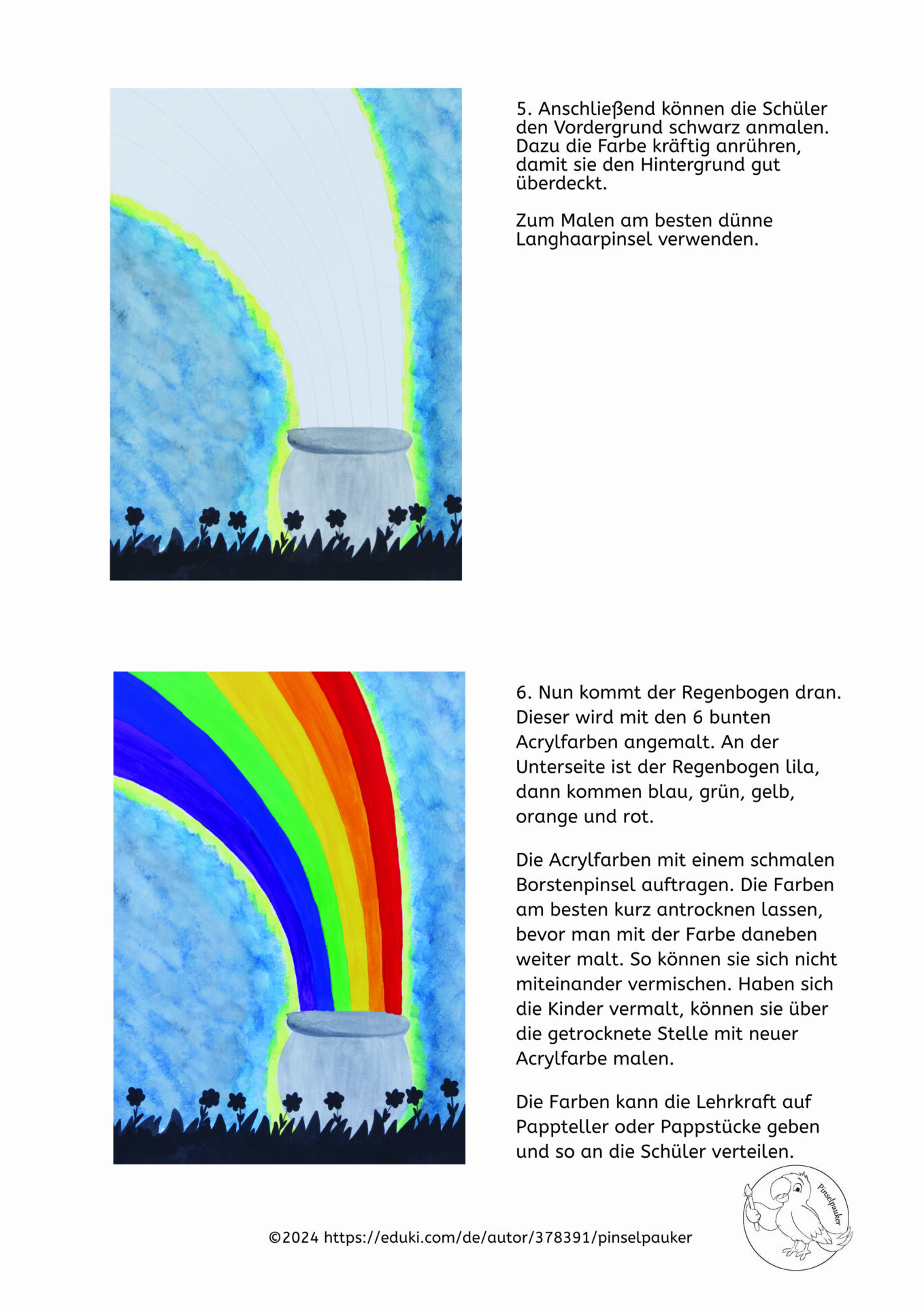 Das Material enthält für die fertige Kunststunde eine Anleitung für Lehrkräfte mit zusätzlichen Tipps und eine übersichtliche Schritt-für-Schritt-Anleitung, die im Kunstunterricht als Präsentation über das Whiteboard gezeigt werden kann.