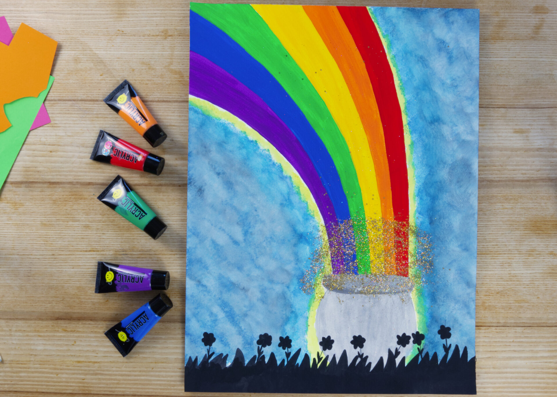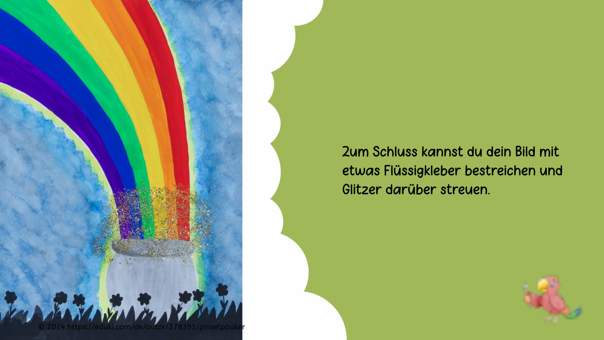 Wo endet ein Regenbogen? Und was kann man an dessen Ende finden? Viele Menschen glauben an einen Topf voll Gold, der am Ende eines Regenbogens steht. Doch gefunden hat ihn noch keiner. Hier können sich die Kinder ihren eigenen bunten Regenbogen mit einem Goldtopf malen. Oder vielleicht steht etwas anderes am Ende ihres Regenbogens?