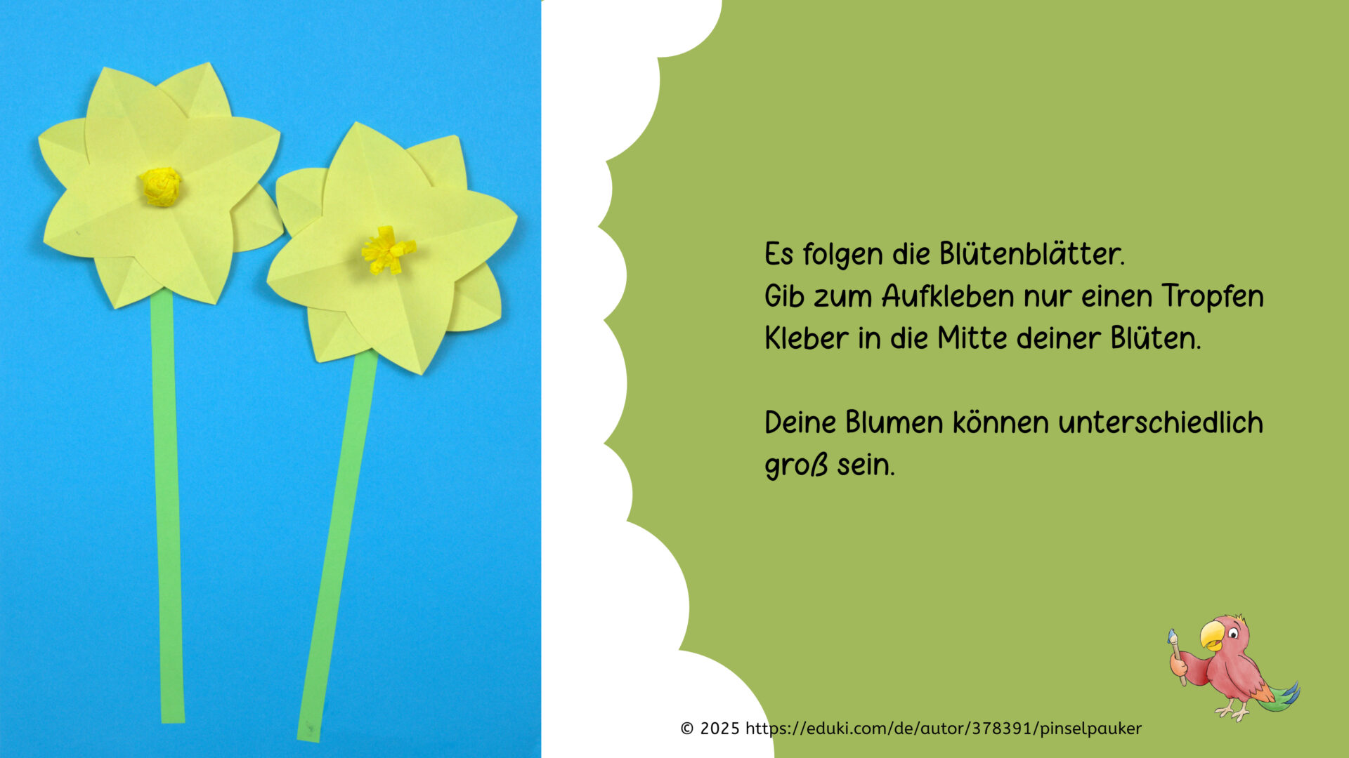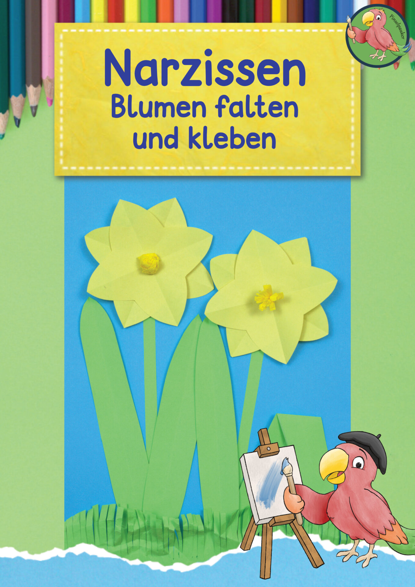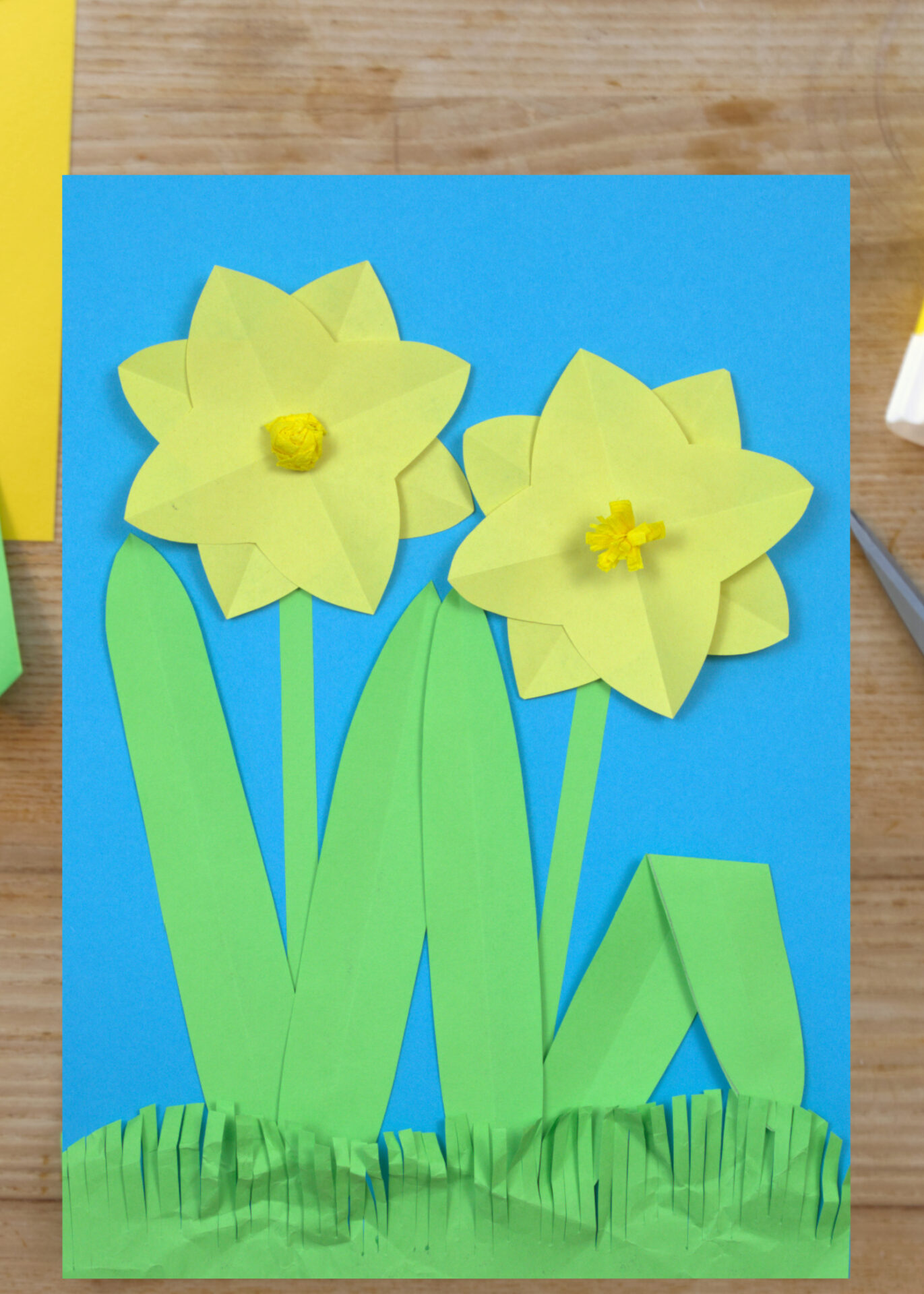 Im Frühjahr verbreiten Narzissen mit ihrer strahlend gelben Farbe eine fröhliche Stimmung. Die Blumen werden aus buntem Papier gefaltet, ausgeschnitten und aufgeklebt. Die Blütenkrone kann auf zwei verschiedene Arten gestaltet werden. Durch die einfachen Formen der Blumen, können bereits jüngere Kinder dieses Bild gut nachbasteln.