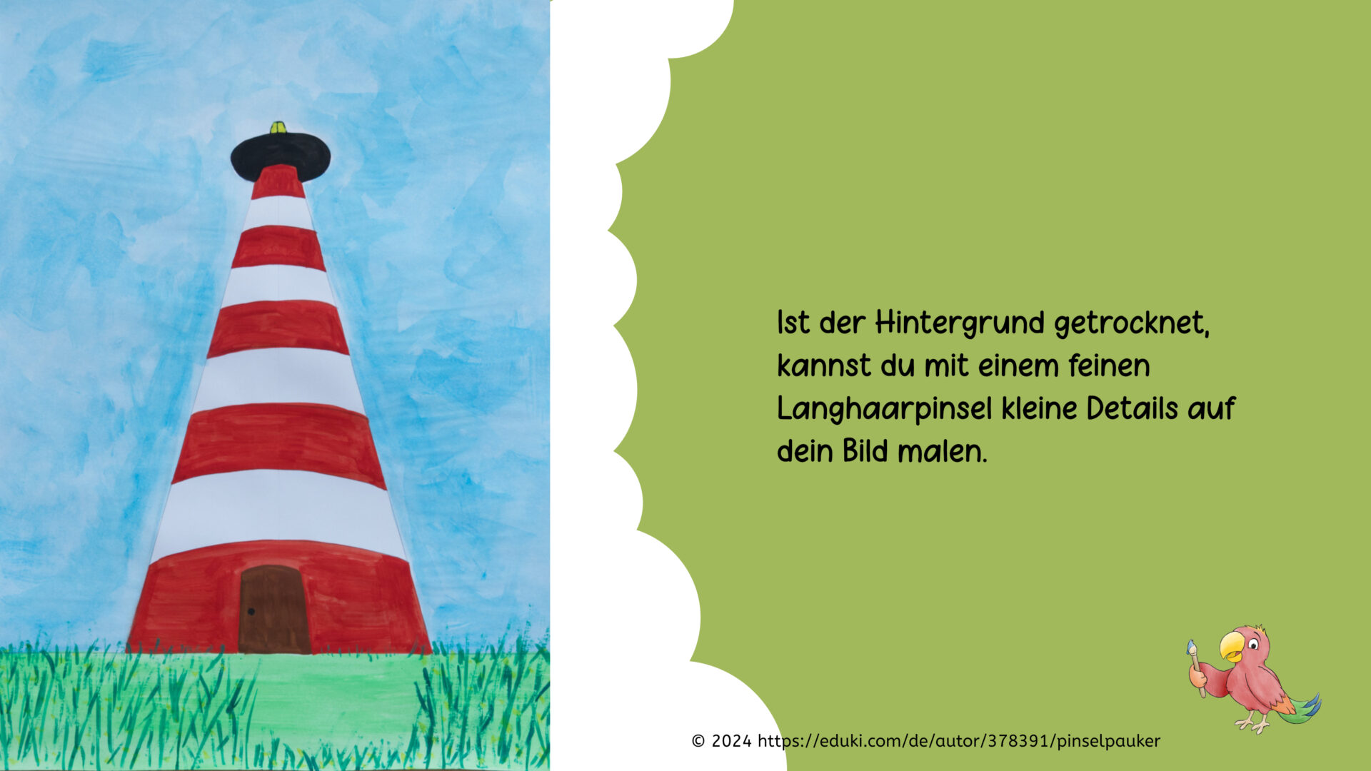 Das Material enthält für die fertige Kunststunde eine Anleitung für Lehrkräfte mit zusätzlichen Tipps und eine übersichtliche Schritt-für-Schritt-Anleitung, die im Kunstunterricht als Präsentation über das Whiteboard gezeigt werden kann.